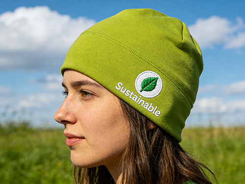 • Eco Beanie: Recycled yarns; sustainable for green eco-friendly branded winter beanies.