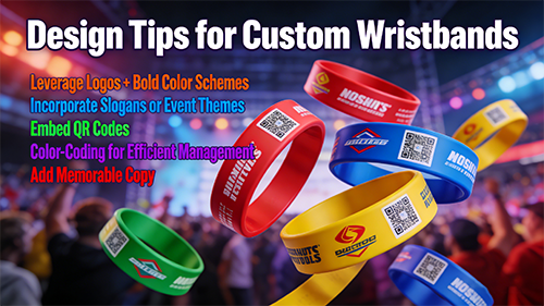 ● Leverage Logos + Bold Color Schemes Brand hues/contrasts for recall in custom logo wristbands for visual impact.